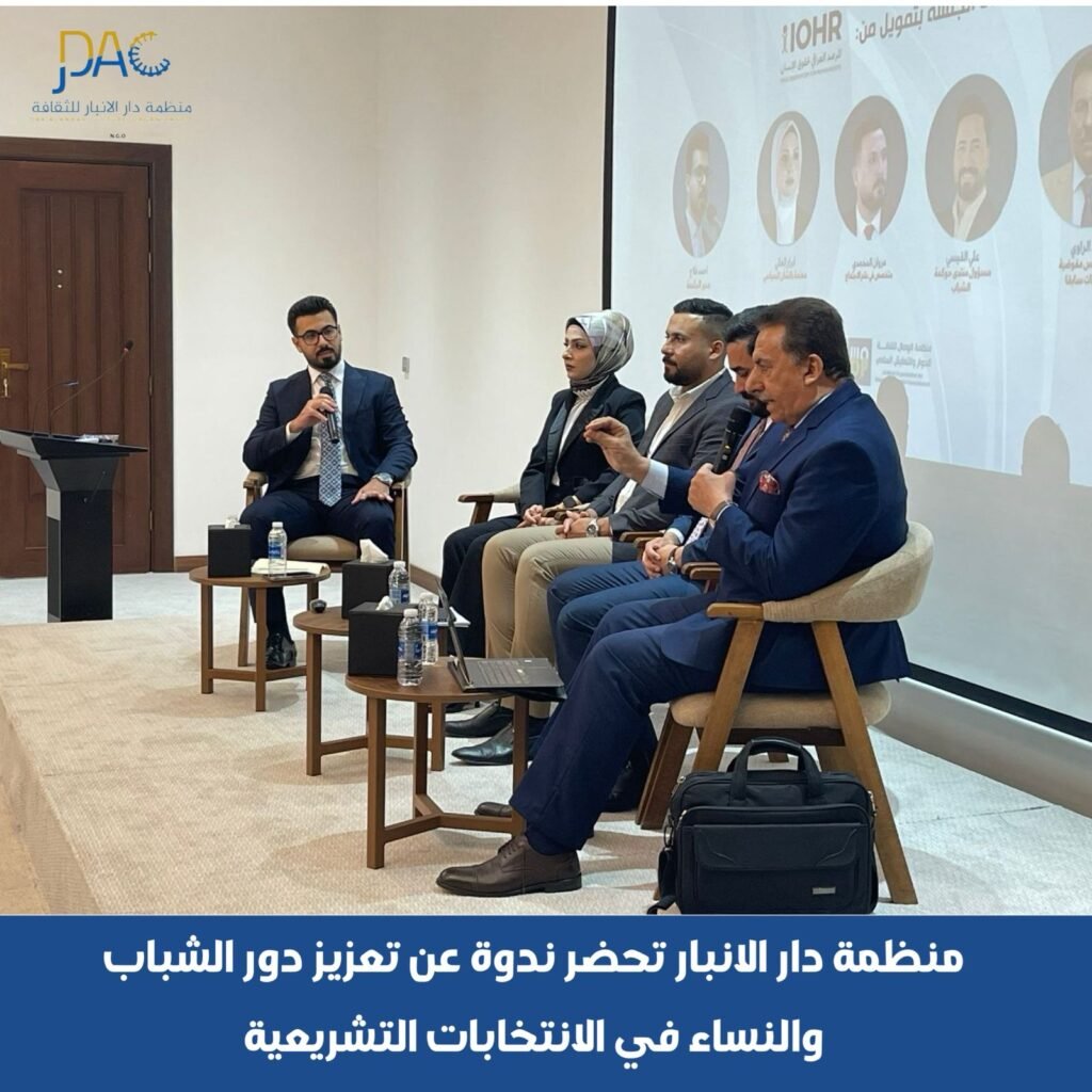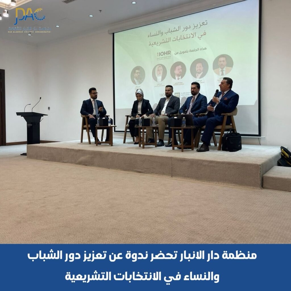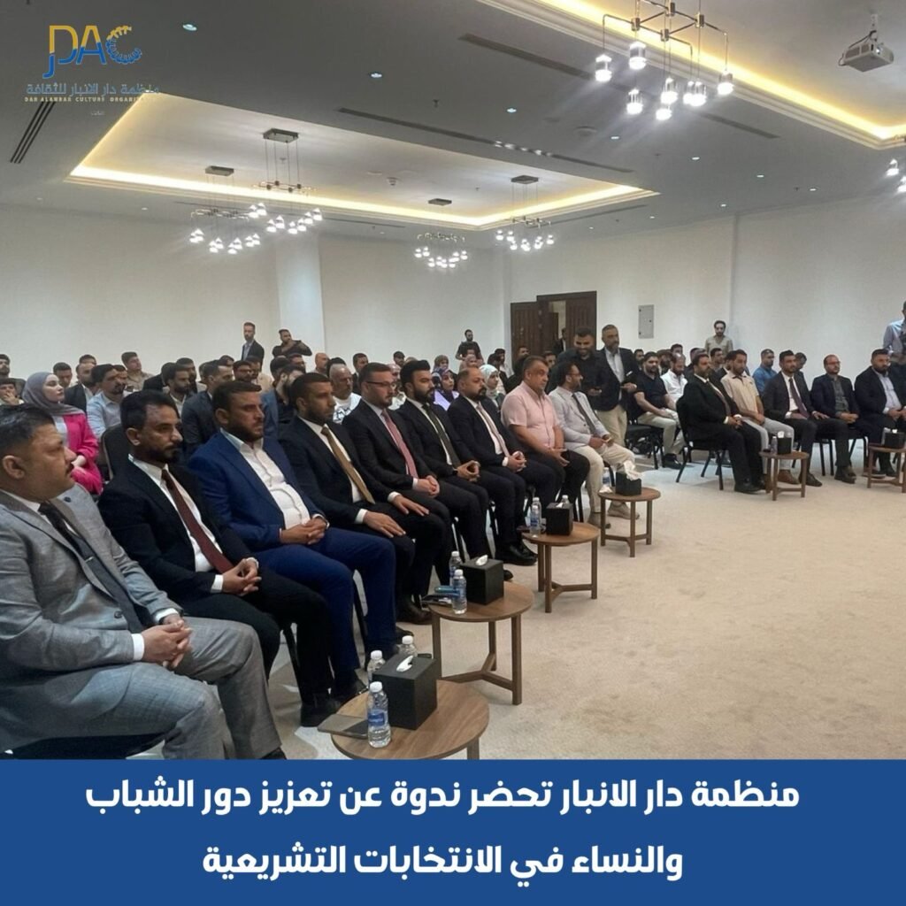 حضر أ.م.د.محمد ابراهيم خلف و د.كرم الخاطر اعضاء الهيئة التأسيسية لمنظمة دار الانبار للثقافة الندوة الموسومة ” تعزيز دور الشباب والنساء في الانتخابات التشريعية” و التي اقامتها منظمة الوصال لثقافة الحوار والتعايش السلمي بدعم من المرصد العراقي لحقوق الانسان اليوم الجمعة الموافق ٢٤ / ١٠ / ٢٠٢٥ على قاعة بابل في فندق الانبار الدولي في الرمادي .