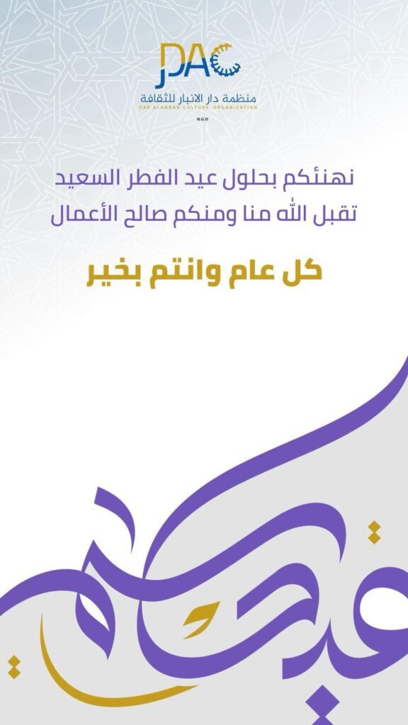 The Dar Al-Anbar for Culture Organization, represented by its President Mr. Mohammed Abdulrazzaq Al-Saadi, along with the members of the administrative board and all its members, extends its warmest congratulations on the occasion of Eid Al-Fitr.